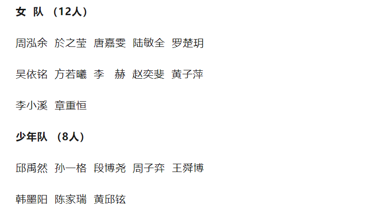 其中俞斌担任总教练,男队丁浩、党毅飞、杨鼎新、李轩豪等34人入选,女队周泓余、於之莹、唐嘉雯等12人入选,少年队邱禹然、孙一格等8人入选。