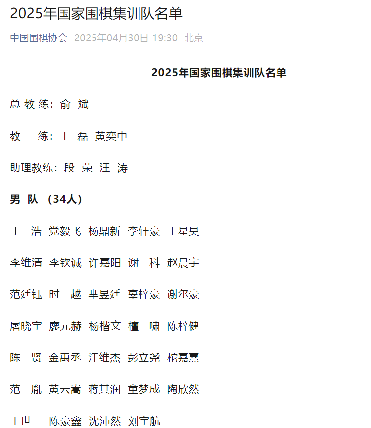 4月30日香港证券杠杆,中国围棋协会公布2025年国家围棋集训队名单。